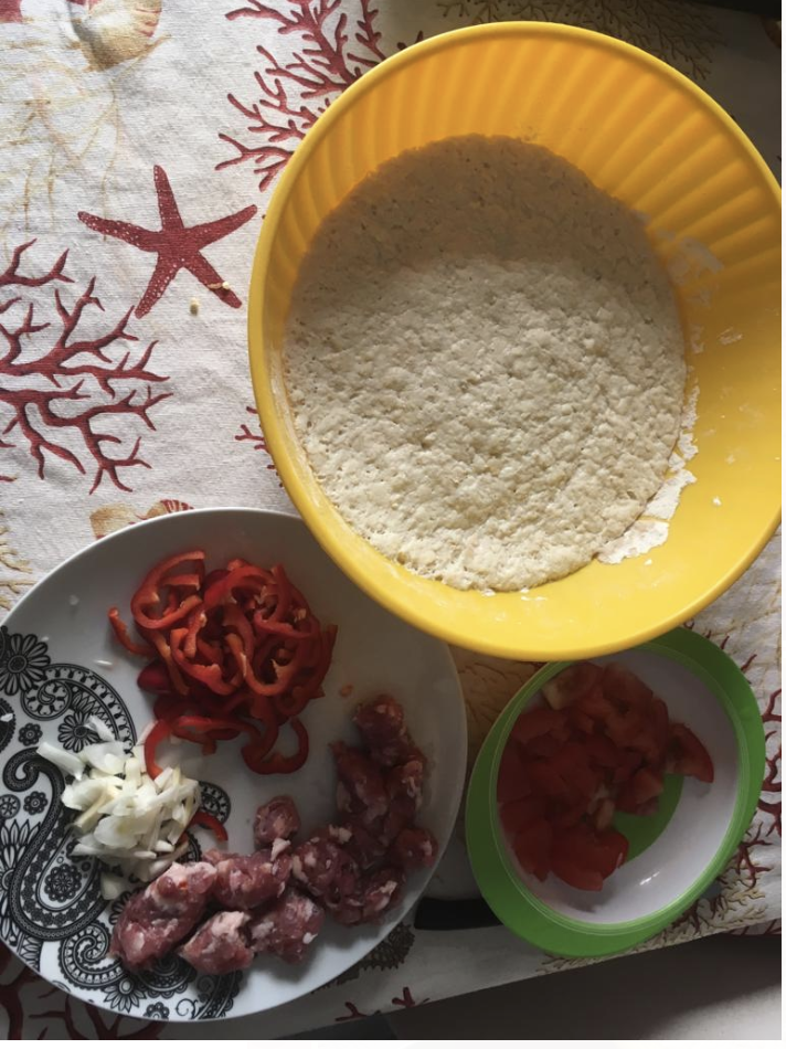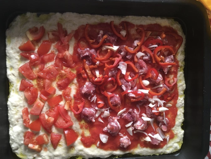 A questo punto la focaccia è pronta da condire, ungete d’olio una teglia bella grande, tenete conto che più grande è la teglia più sottile sarà la focaccia se invece preferite una focaccia bella alta andrà benissimo una teglia di medie dimensioni, siate generosi con l’olio di solito la focaccia non è buona se le mani non sono belle unte quando la si mangia.. Potete versare l’impasto in padella e aiutatevi a stenderlo bagnandovi le mani d’acqua così tenera ad aderire alle pareti senza ritirarsi. Una volta stesa potrete sbizzarrirvi con gli ingredienti Io ho scelti questi legati alla cultura siracusana ma seguendo i gusti culinari personali si possono fare una miriade di variazioni..